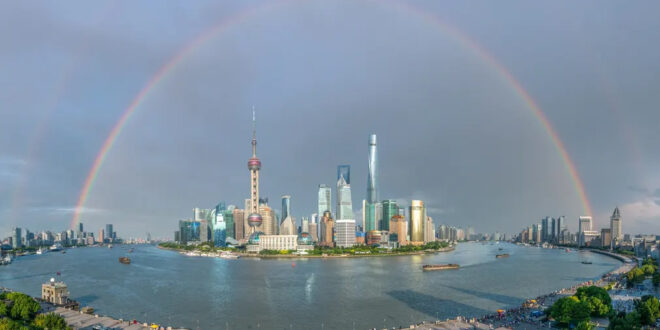 Shanghai, China A rainbow appears in the sky above buildings at Lujiazui Financial District