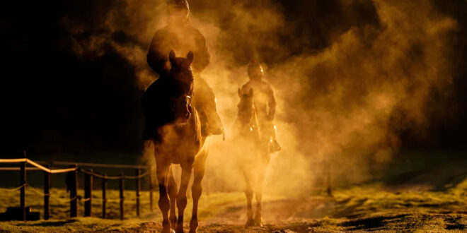 Strensham, UK Horses in the mist at Sam Drinkwater’s Granary Stables in Worcestershire
