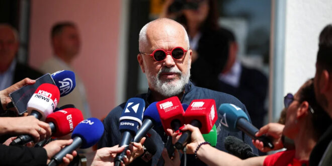 Tirana, Albania The Albanian prime minister, Edi Rama, the leader of the Socialist party, speaks to members of the media after voting during parliamentary elections
