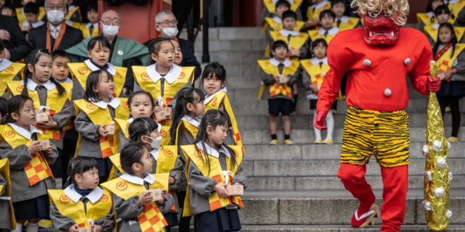 Tokyo, Japan Kindergarten children watch a performer wearing a demon-like costume during a bean-throwing ceremony to drive away evil spirits and bring good luck at the annual Setsubun festival at Sensoji temple