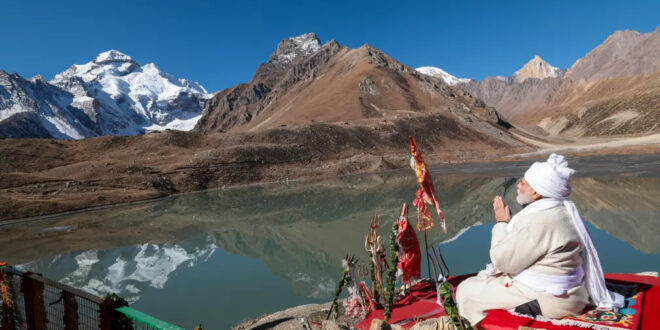 Uttarakhand, India Prime minister Narendra Modi performs rituals and pooja (Hindu prayer) at the pilgrimage site Parvati Kund. Modi is on a visit to the Himalayan state of Uttarakhand and is scheduled to inaugurate and lay the foundation stones for various development projects