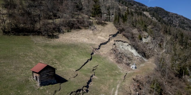 Home / Photo / Vissoie, Switzerland This aerial photograph captures the Fios faultline in the Val d’Anniviers, canton of Valais. The fracture is widening, raising fears that part of the mountainside could collapse, potentially blocking the river below and causing flooding downstream