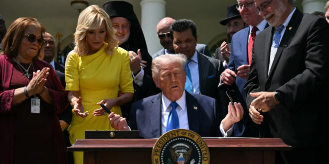 Washington, DC, US President Donald Trump hands out pens as he signs an Executive Order on the Establishment of the Religious Liberty Commission during a National Day of Prayer event in the Rose Garden of the White House