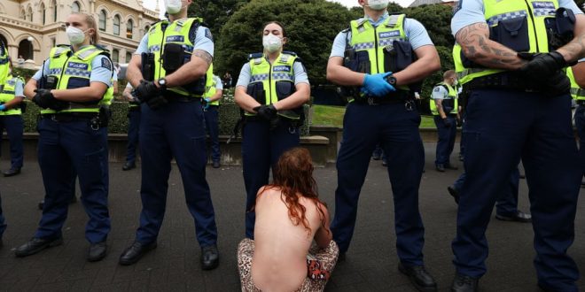 Home / Photo / Wellington, New Zealand A woman sits in front of police before officers moved in to evict protesters in the parliament grounds, on the third day of demonstrations against Covid-19 restrictions
