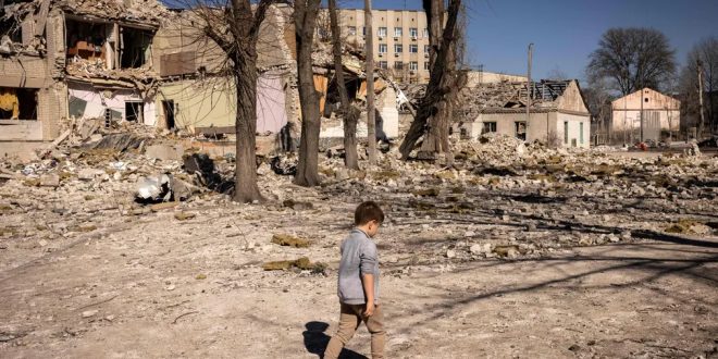 Zhytomyr, Ukraine A child walks in front of a damaged school in the city of Zhytomyr